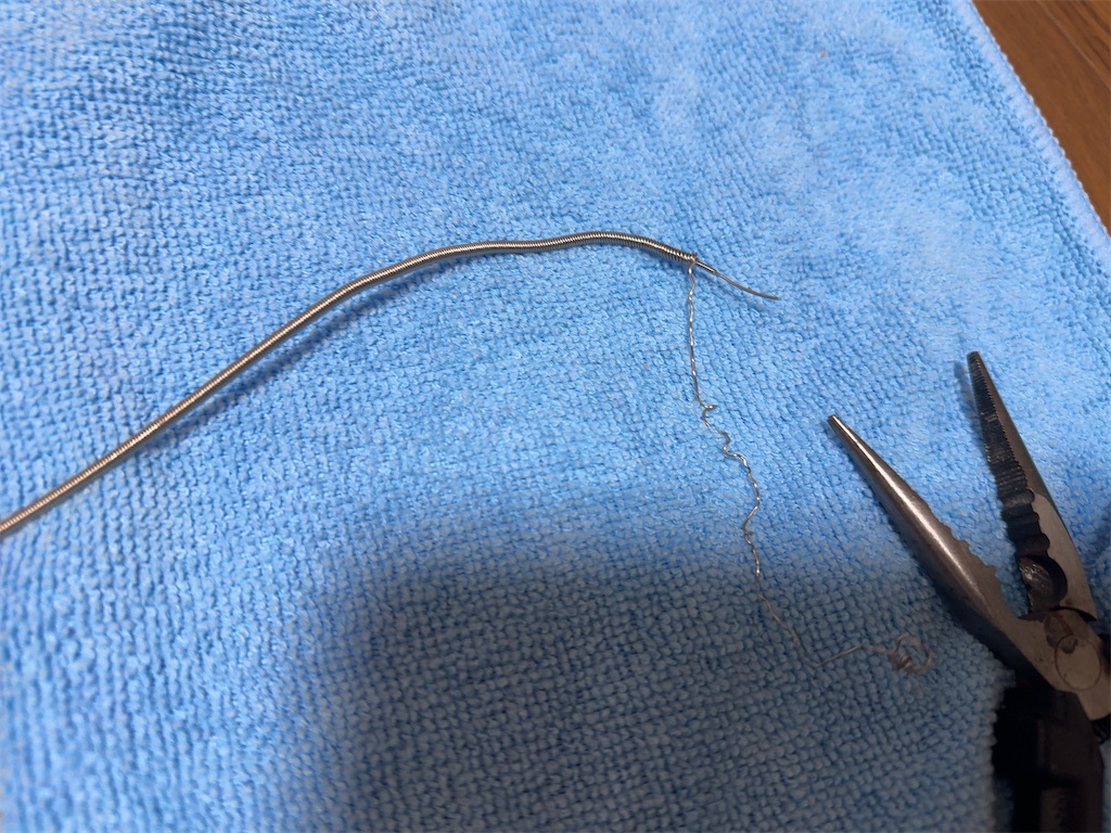 SNSで有名な技術あるリペア屋さんに、ロングスケール用の弦を、ショートスケールでも張れる様にする裏技を教えていただきました。